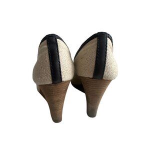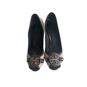 Chic Tory Burch wedges with iconic logo detail in beige and black. Perfect for stylish outings, offering comfort and elegance in every step. Good condition with some wear to wedge and insole partially attached to interior.