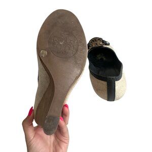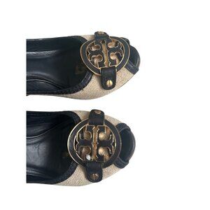 TORY BURCH Beige Black Logo Wedges Sandals Size 6.5