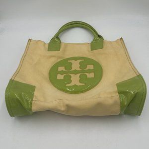 TORY BURCH Beige Canvas and Sage Green Patent Leather Ella Tote Bag