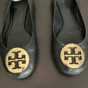 TORY BURCH Black Gold MINNIE TRAVEL BALLET Flat Leather Logo Shoe Sz 6