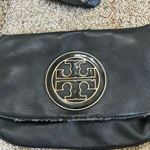 TORY BURCH Black Leather Amanda Logo Clutch Crossbody Chain Link Shoulder Bag