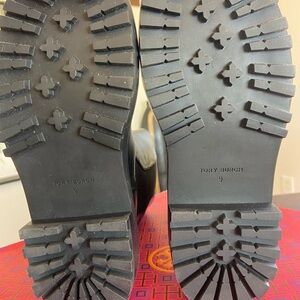 Sleek black leather boots. Chunky sole. Iconic TB goldtone
