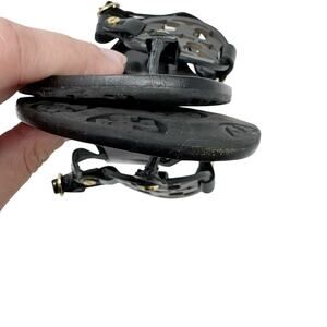 Black Patent leather upper with large logo. Ankle strap with gold tone buckle closure. Cone heel. Wooden footbed. Rubber outsole. Open toe.