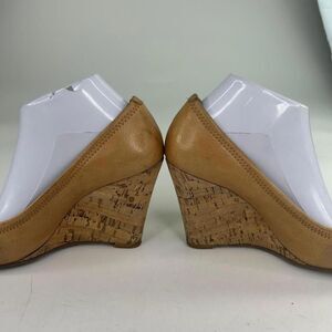 TORY BURCH British Tan Leather Gold Logo Peep Toe US 8 M Slip-on Wedge Heel Pump