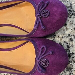 Chic Tory Burch wedges in a vibrant purple. Stylish and comfortable for any outing.