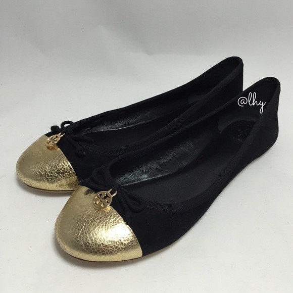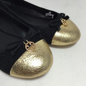 Authentic Tory Burch Chelsea Cap Toe Flats. Black suede upper, leather lining & sole. Metallic gold crrackle leather captoe with bow detail & detachable logo charm. Padded footbed. Excellent condition. No signs of wear above sole. Soles display minimal signs of wear. Box not included. Please be familiar with sizing of Tory Burch footwear; size 8.❌❌ NO TRADES NO PP PLEASE DO NOT ASK❌❌