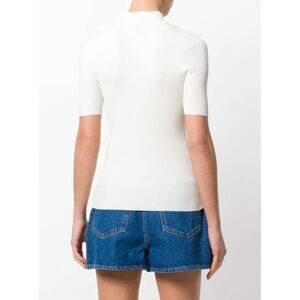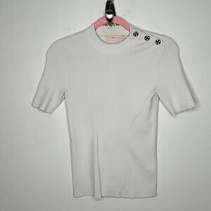 Creating feminine allure in classic yet contemporary styles, Tory Burch creates wearable designs that surpass seasonal trends. Update your knitwear with this ivory Carey mockneck sweater from Tory Burch featuring a ribbed high neck, gold-tone double-T logo buttons to the left shoulder, short sleeves, a ribbed knit, a slim fit and a straight hem.