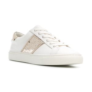 Tory Burch is synonymous with a vintage-inspired aesthetic which has a contemporary twist; her pieces exude class and sophistication without feeling dated. These white and gold-tone Carter sequin sneakers are crafted from calf leather and feature a round toe, a flat rubber sole, sequin embroidery, a lace-up front fastening, a contrasting heel counter and a branded insole.