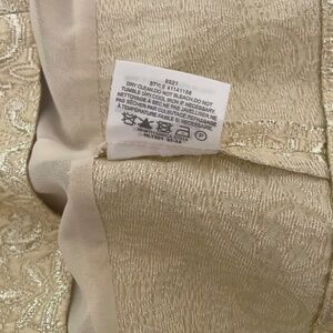 Rounded neckline ~ Sleeveless ~ Henline has a layered or tiered design … top layer/tier has small notches on the hem (front and back) ~ Concealed back zipper closure with a grosgrain ribbon zipper pull ~ Fully lined ~ Fabric is a woven non-stretch jacquard in a brocade pattern ~ Shimmer light gold color