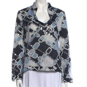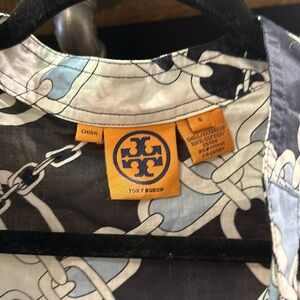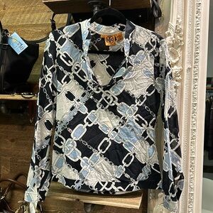 Elevate your wardrobe with this stylish Tory Burch long-sleeve blouse featuring a striking chain print against a color-blocked background of black, white, and light blue. The versatile design makes it perfect for both professional and casual settings. Pair it with tailored trousers for a polished look or jeans for a chic, laid-back vibe.