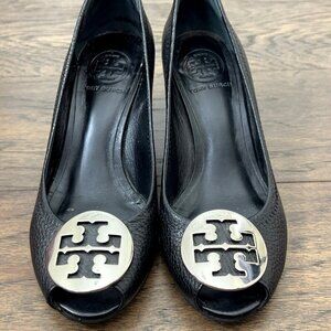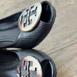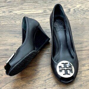 TORY BURCH Chelsea Black Leather Silver Medallion Wedge Heel Sz 6 EUC