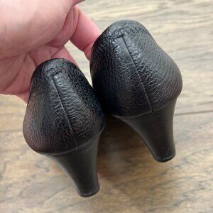 In excellent condiiton! Stacked wedge heel approx 2.5" tall. Leather insole and uppers; rubber outsole keeps you steady in slippery situations.