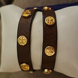 TORY BURCH Dark Brown Leather Logo Stud Wrap Bracelet