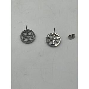 TORY BURCH Designer Silver Miller Round Circle Cut Out "T" Logo Stud Earrings