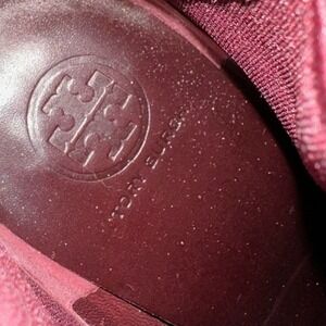 Elevate your shoe collection with these stylish Tory Burch ankle booties. Featuring a pointed toe, pull on closure, and high stiletto heel, these boots are perfect for formal occasions such as weddings or business events. The burgundy suede upper and leather lining add a touch of luxury, while the Tory Burch logo accents provide a designer touch. These boots are versatile enough to be worn in any season, from winter to summer, and the ankle height and solid pattern make them a classic addition to your wardrobe. Whether you're dressing up for a cocktail party or heading to a christening, these booties will add a touch of sophistication to any outfit.