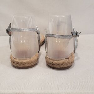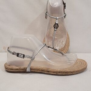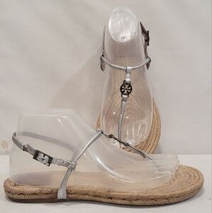 Tory Burch Emmy silver strappy sandals (sz 8). The elastic that holds the buckle is worn somewhat. You can pull the strap to the last opening. Please see all pictures.