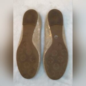 Gently used Tory Burch gold glitter minnie travel flats. They have no size tag but measures at a little over 9", so it equals to a women's size 6 1/2.