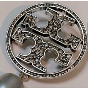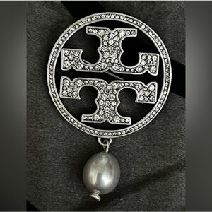NWOT Tory Burch Silver and Swarovski crystal pave double T logo & Crystal Gray Pearl Brooch Pin