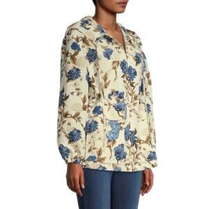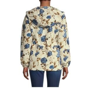 Bring sophistication and function to your outerwear collection with the Tory Burch Floral Print Hooded Wind-Resistant Jacket. Featuring a striking blue and taupe floral motif on a soft cream base, this lightweight layer combines elevated style with practical weather protection. Its relaxed silhouette and drawstring hood make it ideal for transitional seasons, whether for city strolls, travel, or outdoor events.