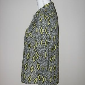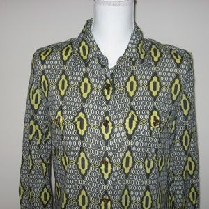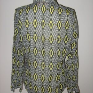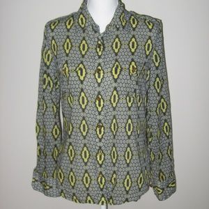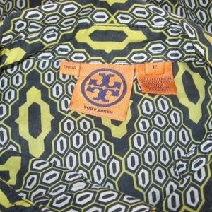 TORY BURCH Lime Green & Black Geometric Print Women's Button Front Shirt. Size 12. Fabric: 100% Cotton. Gold Tone Buttons Stamped w/Logo "T/T". Chest Pocket. Button Front. Long Sleeve. Excellent Pre-Owned Condition.