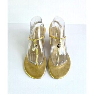 TORY BURCH Gold Emmy Wedge Sandals Metallic Leather Sz 10 Logo Ankle Strap