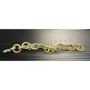 Elevate your style with this Tory Burch Silver and Gold bracelet featuring a chunky rope chain and toggle clasp. Perfect for adding a touch of elegance to any outfit.