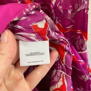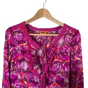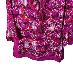 TORY BURCH Gwenda Tunic Blouse Top in "Habanero Pepper". Style 12121156. Swirls pattern with contrast trim. V neck with tassel tie closure and branded hardware. Three-quarter sleeves with ruffled trumpet cuffs. Side vents. Semi sheer.