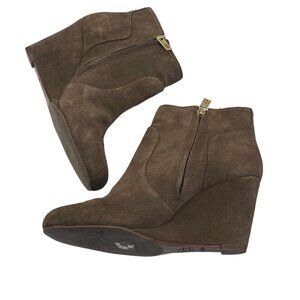 Step out in style with these chic Tory Burch wedge booties crafted from soft suede with tonal topstitching. Featuring a comfortable 3” covered wedge heel, a 4” ankle-high shaft with a stylish side buckle, and an interior side zipper for easy on and off. Signature double-T logo on the side adds a designer touch, while the layered vamp and heel counter provide sophisticated detailing.