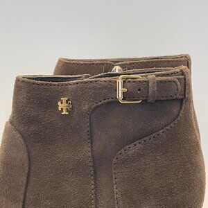 Step out in style with these chic Tory Burch wedge booties crafted from soft suede with tonal topstitching. Featuring a comfortable 3” covered wedge heel, a 4” ankle-high shaft with a stylish side buckle, and an interior side zipper for easy on and off. Signature double-T logo on the side adds a designer touch, while the layered vamp and heel counter provide sophisticated detailing.