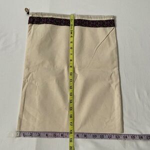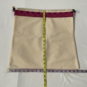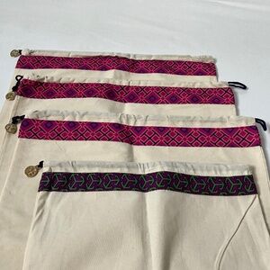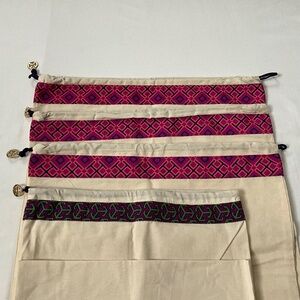 Lot of 4 Tory Burch draw string dust bags in natural cotton twill canvas. The three with the pink bands are approximately 17”x17” square (slight variation in measurements between the 3 bags). The fourth dust bag with the purple band is approximately 14” wide and 18” tall. Excellent condition- no issues found other than light wrinkles/creases. Measurements in photos.