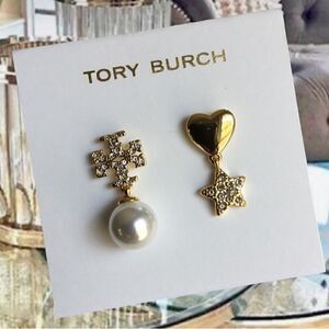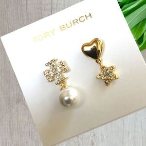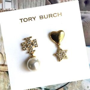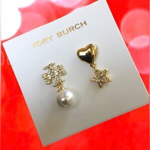 TORY BURCH MISMATCHED PEARL, HEART START DOUBLE T LOGO EARRINGS 14K GOLD OVER BRASS