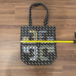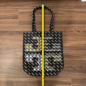 Stylish black tote bag with a vibrant multicolor pattern. Perfect for everyday use.