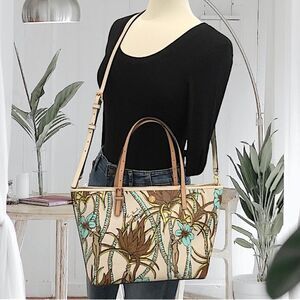 TORY BURCH NATURE PRINTED CANVAS TOTE FLOWERS PALMS BROWN TURQUOISE CREAM