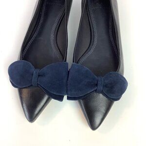 TORY BURCH NAVY LEATHER BOW LOGO POINTY BALLERINA FLATS
