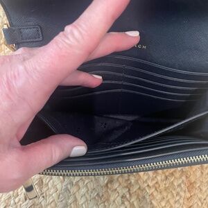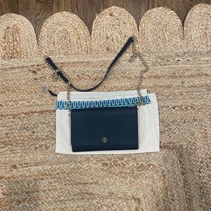 Bought for a wedding and never used! Darling bag. Can be used as a clutch or a crossbody purse. So much to offer inside. 5 pockets inside including 1 zipper pocket. 2 different slots for credit cards etc. Beautiful gold chain with leather shoulder pad. Outside pocket fits most all phones. Includes TB cloth bag for storage.