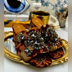 The new party shoe: Tory Burch's Martine Slide. Crystal embellishments dress up the simple backless shape, crafted in a rich burgundy jacquard fabric, while a block heel makes it ultra-comfortable to wear.