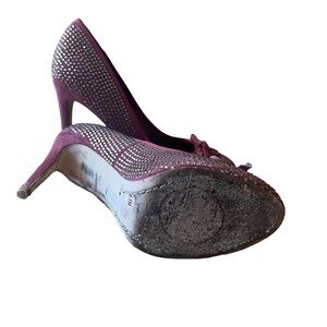 NOTE: 6 crystals missing on right shoe (not noticeable), wear on back of heel (both shoes), bottoms shoes significant wear, minor stain on right shoe top (see photo)