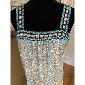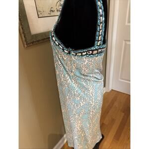 TORY BURCH Print sea coral turquoise blue beaded neckline silk knit midi sz M