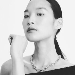 Bold and sculptural, the Roxanne necklace combines chunky links with Double Ts in striking silver. Designed to sit above the collarbone, it looks chic solo or layered with longer chains.
