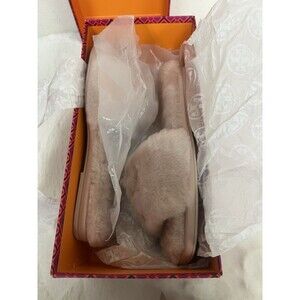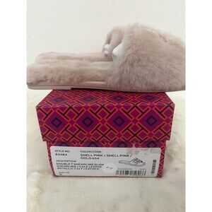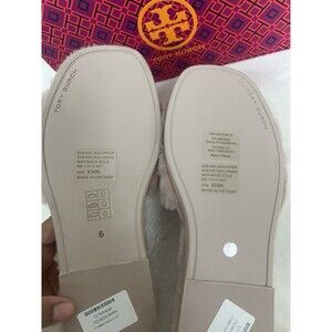 TORY BURCH SHEARLING SLIDE SANDAL SHELL PINK /GOLD TRIM DOUBLE LOGO SZ US 6 NEW