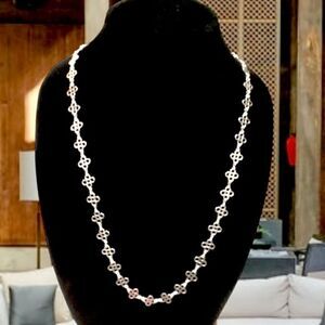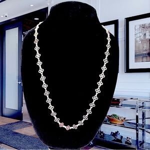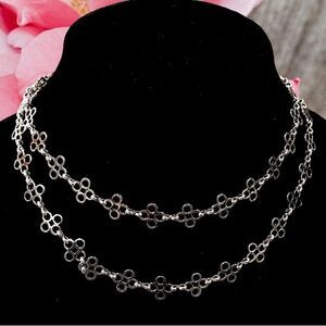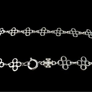 Tory Burch Silver Rhodium Plated Necklace! This stunning piece is 41 inches long and can be worn in two rows or as a long statement piece. Made with high-quality rhodium plating, this necklace will add a touch of elegance and glamour to any outfit. Whether you're dressing up for a special event or adding a touch of sophistication to your everyday look, this necklace is sure to turn heads.
