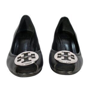 Flattering wedge heel from Tory Burch has a tumbled black leather upper accented with a large silver medallion. Peep toe. Stacked wedge. Made in Brazil. Retail: $250.