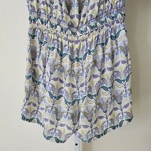 -Off the shoulder neckline, one-piece pull-on style romper short is made with 100% silk, with tiny blocks of blue/lilac/yellow/green floral and paisley pattern design
