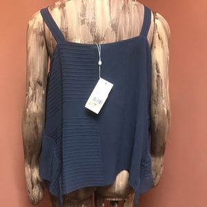Blue Tory Burch silk top with square neck and tonal stitching throughout. Includes tags.