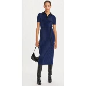 TORY BURCH Striped Knit Polo Midi Dress In Navy Black Size Large Short Sleeve