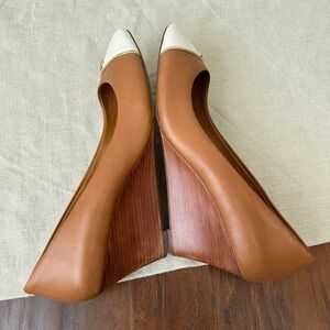 TORY BURCH Tiffy Two Tone Leather Wedge Pumps Cap Toe in Tan White Sz 8