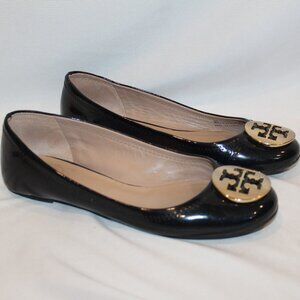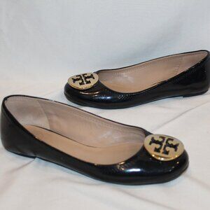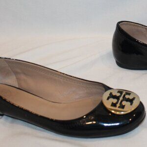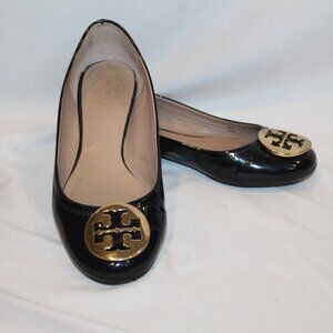 TORY BURCH WOMEN'S PATENT BLACK LEATHER BALLET FLATS GOLD LOGO SZ 7.5