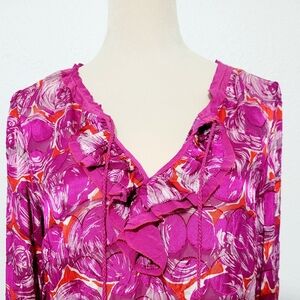 Add a pop of color and designer flair to your wardrobe with this beautiful Tory Burch women's tunic blouse in a vibrant geometric print. Featuring a flattering 3/4 flutter sleeve, ruffled V-neckline with tie-front detail, and lightweight silk blend fabric, this top effortlessly blends comfort and elegance.
