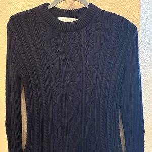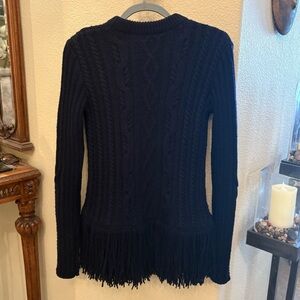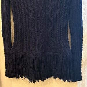 Pre-owned in great condition with no rips or stains. Missing care and material tag inside. Wool blend. Stretchy knit. Stylish navy cable knit sweater featuring fringe detail. Perfect for a cozy look. Comes from smoke and pet free home.