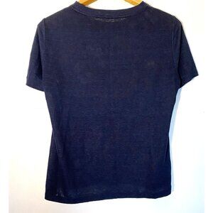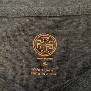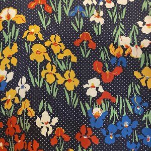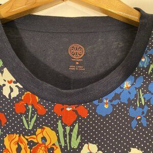 Tory Burch blouse in multicolored floral print on silk of iris flowers with micro polka dots. Front of shirt is 100% silk, back panel and sleeves are 100% linen in Navy color. Laid flat, this blouse measures 19" armpit to armpit, 21" from front bottom neckline to hem and 8” base shoulder to end of sleeve. Excellent condition all over, with NO stains, snags, tears, odors or damage. As linen is a natural material, there are minor variations in it.